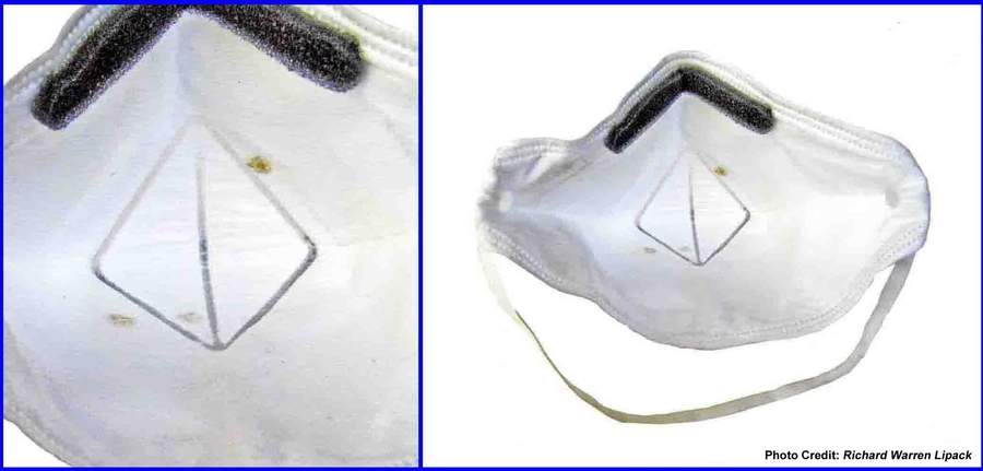 Photographs of the inside of the "SAS" NIOSH N95 mask taken after leaving the hospital accompanying this article document three yellow-red-brownish spots of varying densities each measuring approximately 1/4" diameter. These spots were found centered inside the mask's surface area where air was drawn in by the mouth and nose during breathing.