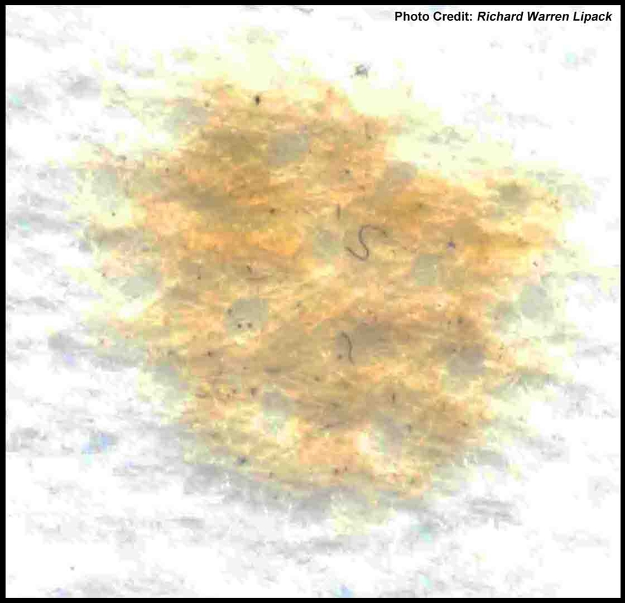 Image 3 - View Here - Close-up 3200 DPI scan of one of 3 apparent bacteria spores that water DILUTED iodine appears to have killed on N95 mask. Note tiny patterned holes in mask, which air passes through.