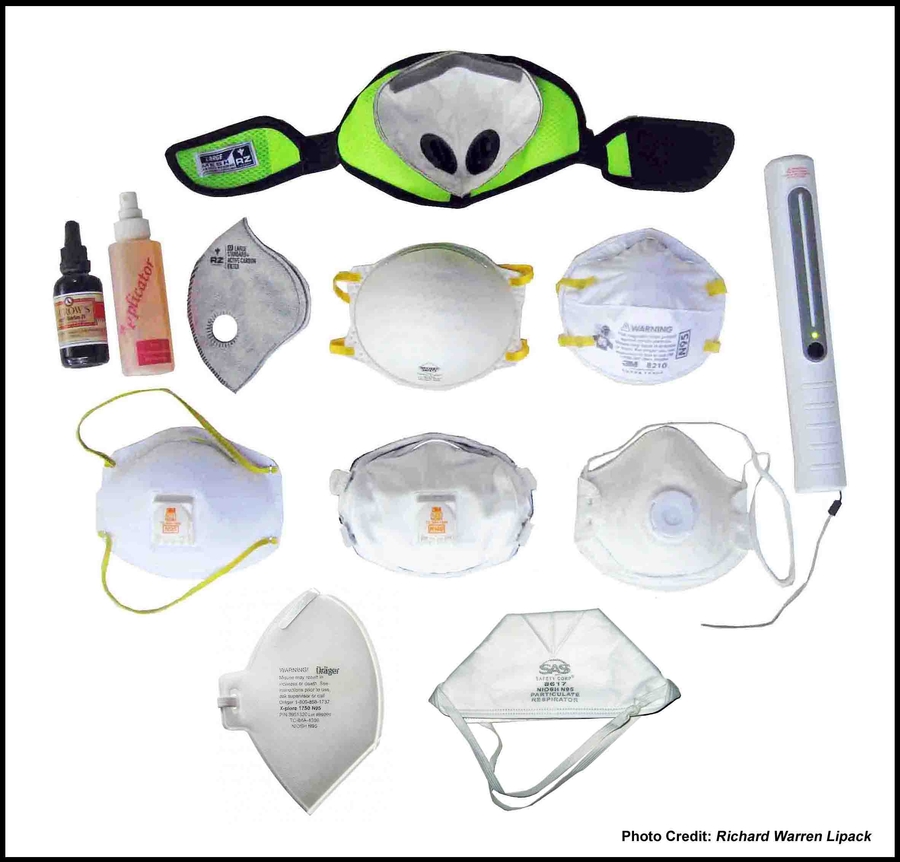 Image 5 - View Here - Various N95, N99 and N100 rated respirator face masks along with UV-C ultra violet light sanitizing wand and applicator bottle of water with DILUTED iodine beside a bottle of store bought iodine.