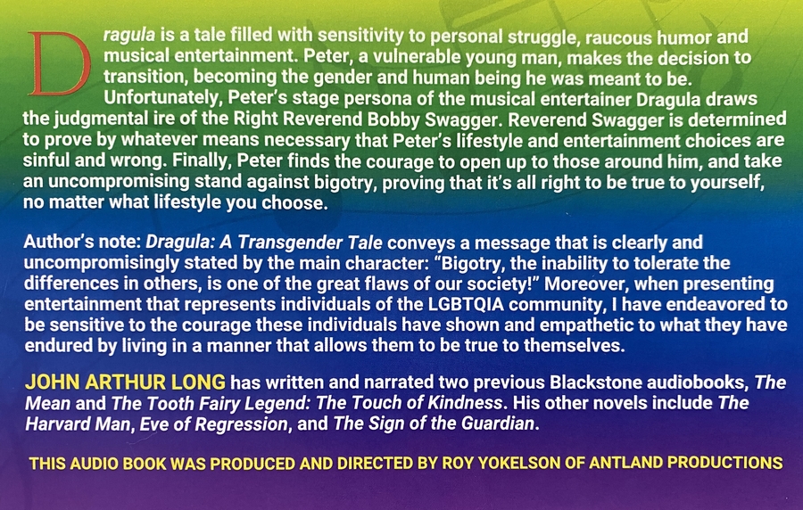 According to audiobook multi-award nominated performer and writer, John Arthur Long, DRAGULA, A Transgender Tale, conveys a message that is clearly and uncompromisingly stated by the main character: "Bigotry, the inability to tolerate the differences in others, is one of the great flaws of our society!" Moreover, the audiobook narrator states that when presenting entertainment that represents individuals of the LGBTQIA+ community, he has endeavored to be sensitive to the courage these individuals have shown and empathetic to what they have endured by living in a manner that allows them to be true to themselves. Vellum Publishing notes that a rave review from Broadwayworld.com supported the author's words when it wrote that DRAGULA was "...Fantastically hilarious, entertaining, and still made a statement about who may be truly different in a heterosexual...dominated world."