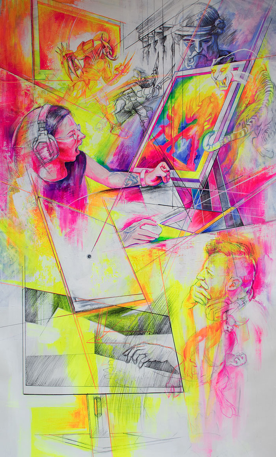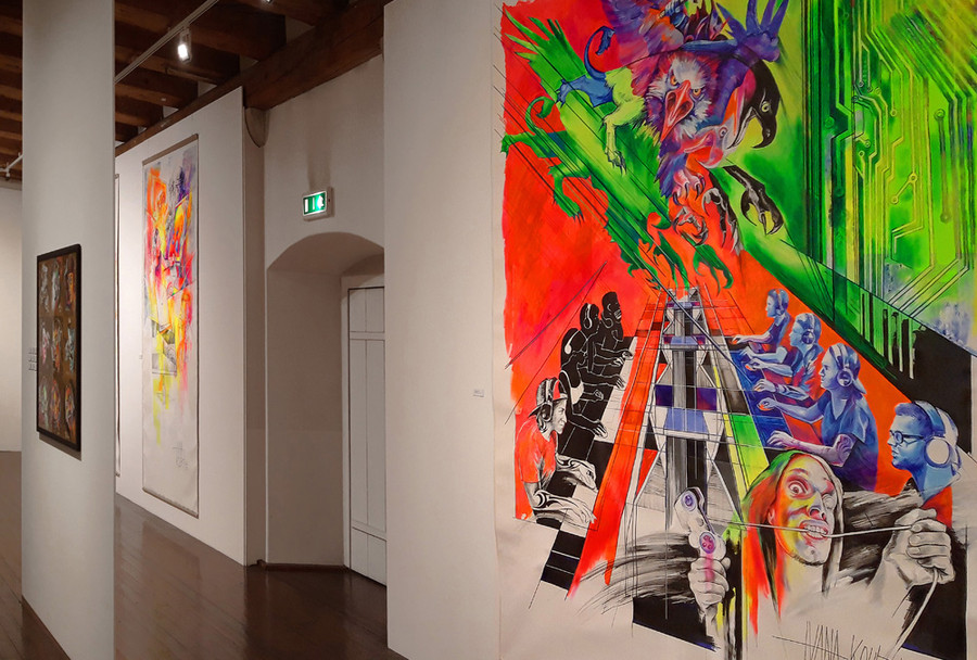 REGENSBURG, GERMANY, November 02, 2020 /24-7PressRelease/ -- The new works by Ivana Koubek, dedicated to video games, are technically and colorfully daring. A total of three monumental canvases, each 3.5 m high, and thirty large and small works on paper occupy half of the exhibition space. Not only thematically, but also by using garish neon colors from the virtual worlds of video games, they stand in complete contrast to the ground tones of her older works. It is not for nothing that Koubek devotes herself to the subject of gaming in the works created in 2019/2020: with up to 60% of the population playing video games, the subject is highly topical and exciting for every generation. The main focus is on the emotions and feelings of video gaming. Joy, success, as well as fear and anger, which players feel when playing video games, become the leitmotif. With enthusiasm, they enter the attractive worlds of video games, in which reality and virtuality unite to form a momentary reality.