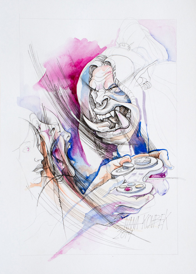 Finally, the third canvas LAN party was created under the impression of a visit from the Dreamhack in Leipzig. The neon colors and themes seen there can also be found in the colorful works on paper. Inspired by World of Warcraft, The Legend of Zelda, and Super Mario, they show emotional relationships between avatars and gamers.