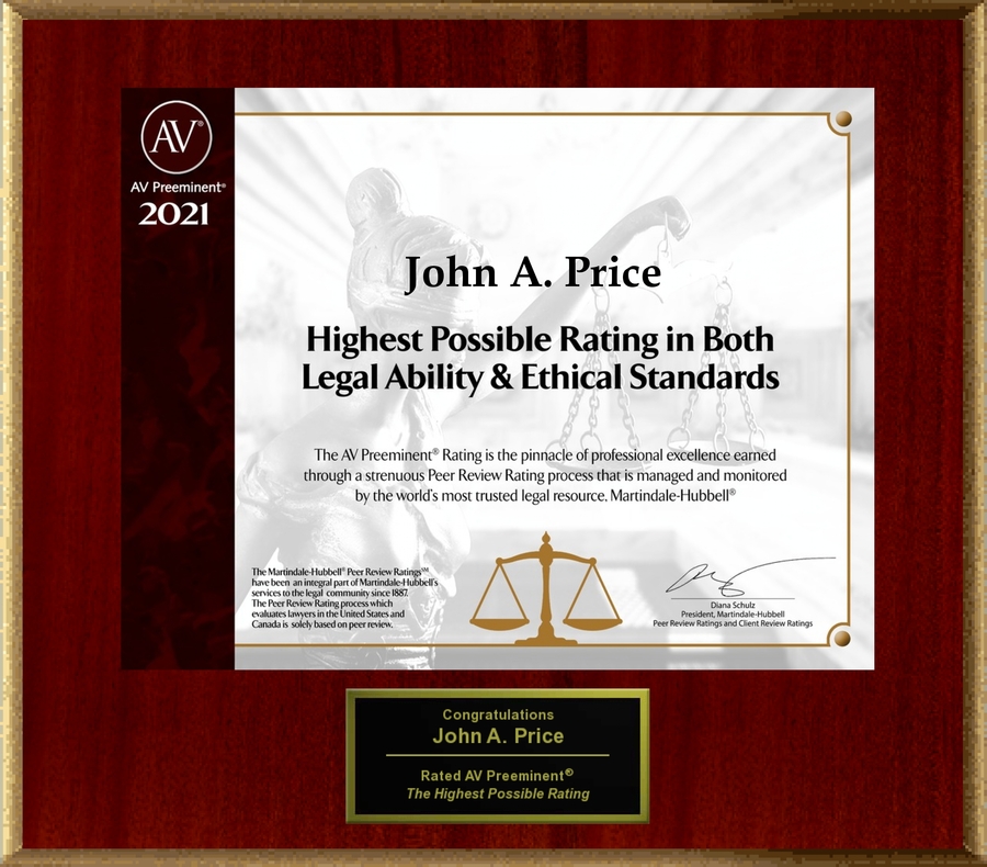 John A. Price commented on the recognition: "The Martindale-Hubbell AV Preeminent Rating is a credential highly valued and sought after in the legal world. It used to be a sort of secret among attorneys who used the rating as a first screen when they needed to hire a lawyer they did not personally know. Now, thanks to the Internet, the Rating is a great way for anyone - lawyers or lay people - to use to screen lawyers. I am thankful to my peers who nominated me for this distinction, and proud to have earned this, the highest possible Martindale-Hubbell rating."