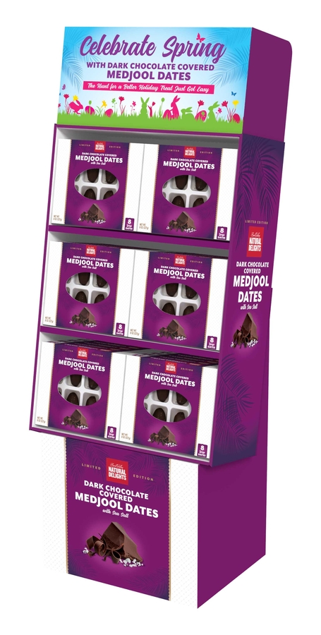 The Dark Chocolate Covered Medjool Dates merchandiser is also versatile. It can change to focus on spring sales by replacing the easily changeable corrugated header card. The new "Celebrate Spring" header features Easter graphics with the tagline: "The Hunt for a Better Holiday Treat Just Got Easy." Retailers can contact Neil Merritt, Director of North American Sales for Bard Valley Medjool Date Growers, for sales and promotional information. He can be reached at [email protected].