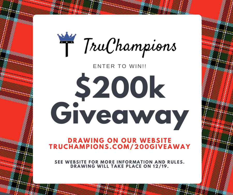 There will be 50 winners selected. No purchase necessary. Drawing will take place on their social media channels on December 19, 2020, at Noon EST. To enter the drawing, please visit www.truchampions.com/200giveaway