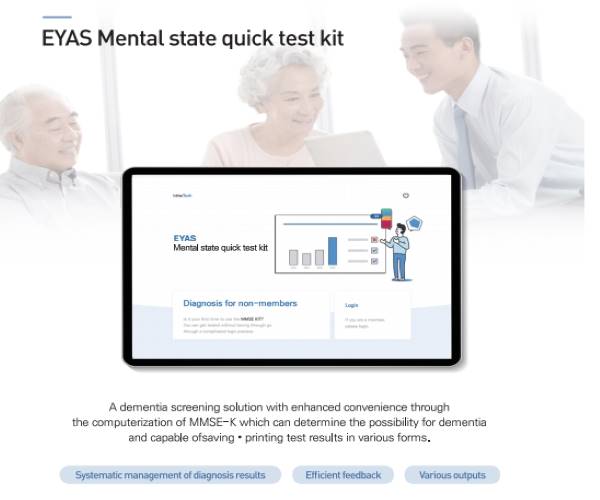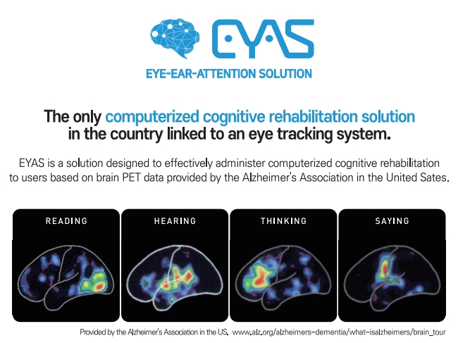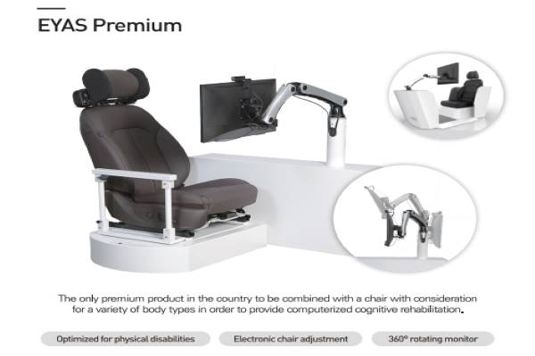EYAS, the only visually linked cognitive rehabilitation solution in Korea, consists of product lineups such as EYAS PREMIUM, EYAS MULTI, EYAS STANDARD, EYAS 1.0, and EYAS MMSE-K KIT. Among them, EYAS PREMIUM is the only chair-combined premium solution in Korea that considers various experiences of users for computerized cognitive rehabilitation. With the electric chair adjustment and 360° monitor screen, it is optimized for patients with physical disabilities. Also, by using EYAS MULTI, which provides wired/wireless networks and allows free movements and deployment, is designed to allow managers to perform cognitive rehabilitation training for a large number of people by utilizing remote functions.