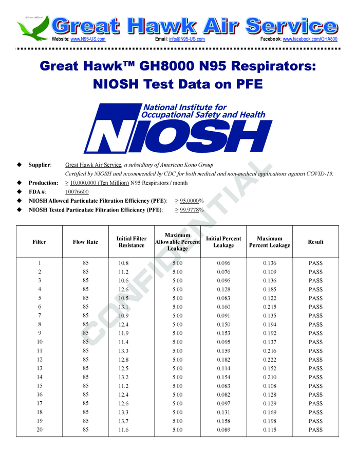 SEATTLE, WA, February 01, 2021 /24-7PressRelease/ -- Great Hawk Air Service ("GHA") is pleased to announce that National Institute for Occupational Safety and Health ("NIOSH") has just approved its Great Hawk™ GH8000 N95 Respirators, the 3rd type of Great Hawk™ N95 respirators, for COVID-19 prevention worldwide.