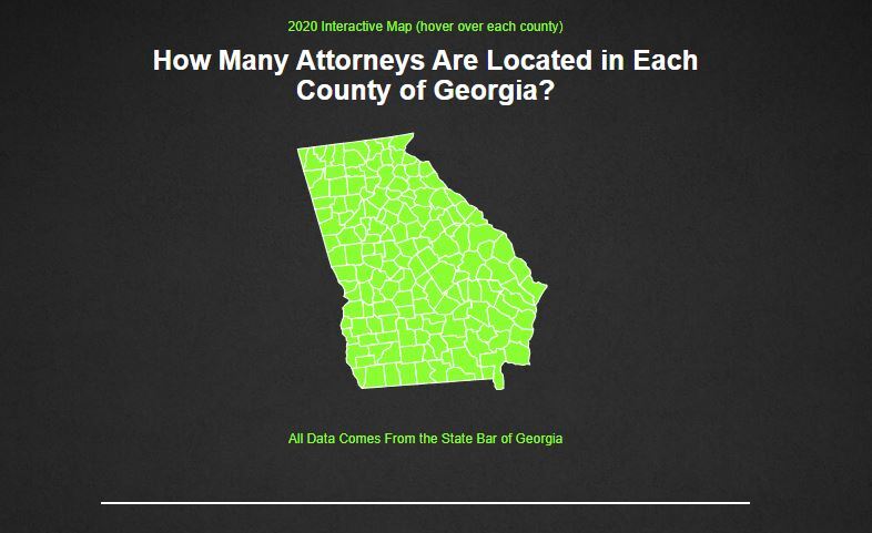 Attorney Christopher Simon displays an interactive map of Georgia listing out how many attorneys are in each county as of 2020 to help you figure out where may be best to practice. The map allows you to hover over each county to see how many attorneys are in each. Start by clicking the link below: