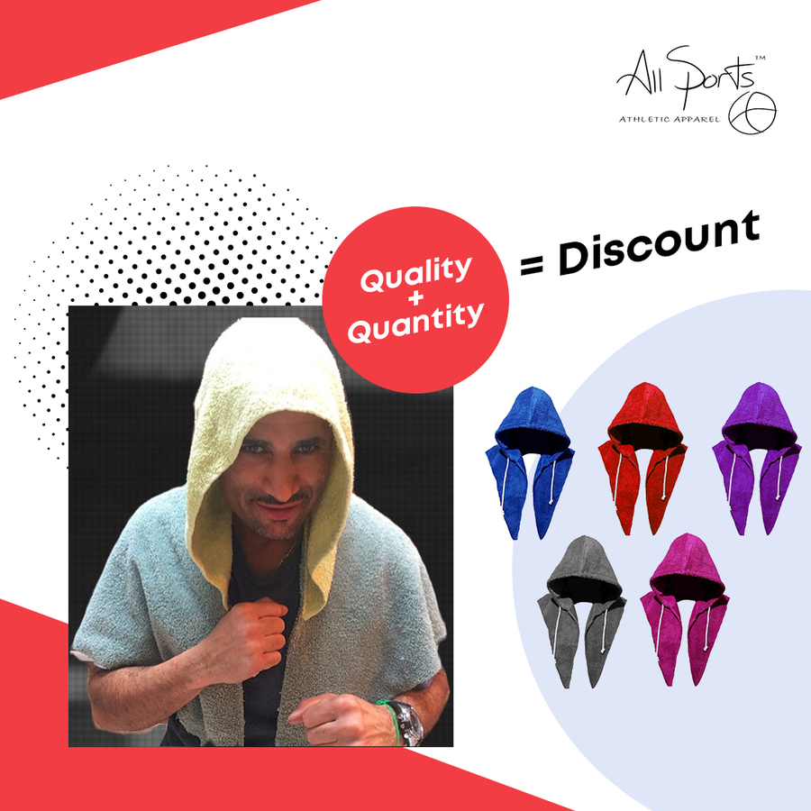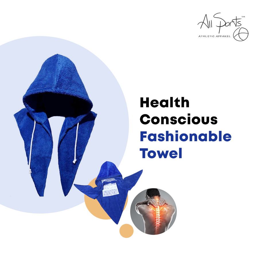 The AllSports hooded towel transcends the common athletic attire. Its clever design includes a large hood, drawstrings, an opening in the hood and strategically positioned pockets. The drawstrings help in keeping it in place while one is engaged in a workout. The opening in the hood allows long hair to pass through it to hang freely. The two pockets are strategically positioned to place hot or cold packs for directly compressing Cervical and Thoracic spine, which helps in soothing any pain or aches, and regulates body temperature after one indulges in sports for long hours.