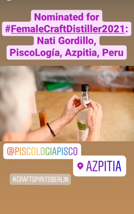 BERLIN, GERMANY, March 01, 2021 /24-7PressRelease/ -- PiscoLogía's Master Distiller and partner, Nati Gordillo, was designated Female Craft Distiller of the Year by Craft Spirits Berlin, Europe's premier event for handcrafted spirits. Highlighting the unique terroir of Azpitia, Peru, and Nati's meticulous artisanal methods, Craft Spirits Berlin declared: "This has to be paradise: green, fertile slopes with grapevines on top, a gentle microclimate, protected by the high mountains that open up directly behind them…..From the cultivation of the vines to the harvest, the pressing of the grapes, later the distillation and the bottling and labeling, the responsibility lies with Nati Gordillo."