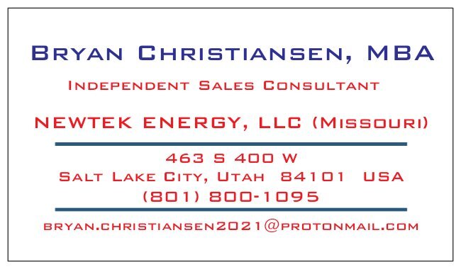 For more information on NewTek's product offerings, please contact Mr. Bryan Christiansen in Salt Lake City, Utah at (801) 800-1095 and visit www.newtekenergy.com to see testimonials by satisfied clients. Christiansen is a 35-year veteran of the high-technology industry who is fluent in Chinese, Japanese, and Spanish.
