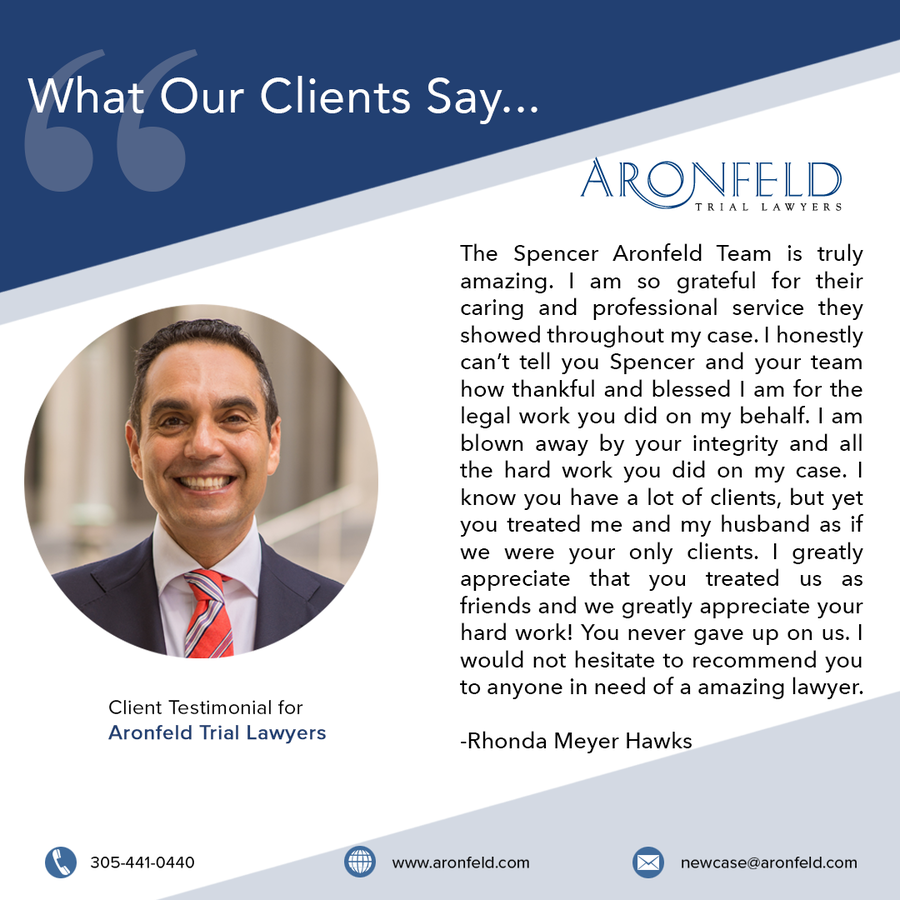 Miami-based Aronfeld Trial Lawyers was established by Board Certified Trial Lawyer, Spencer Aronfeld in 1991. The firm represents cases resulting in serious injuries in the areas of Maritime Law, Automobile Accidents, Premises Liability, Cycling Accidents, Slip and Fall Incidents, Wrongful Death, Medical and Dental Malpractice, Product Liability, Civil Rights Claims, Workplace Injuries, Maritime Law, Sexual Assault, and others. Every client receives the full benefit of our experience, our resources, and our commitment. The practice of personal injury law is our calling. We are a firm of high-profile, nationally recognized legal advocates who work for you, our client, never big business. All attorneys and staff members at the firm are bilingual speaking Spanish. To learn more, visit https://www.aronfeld.com/.