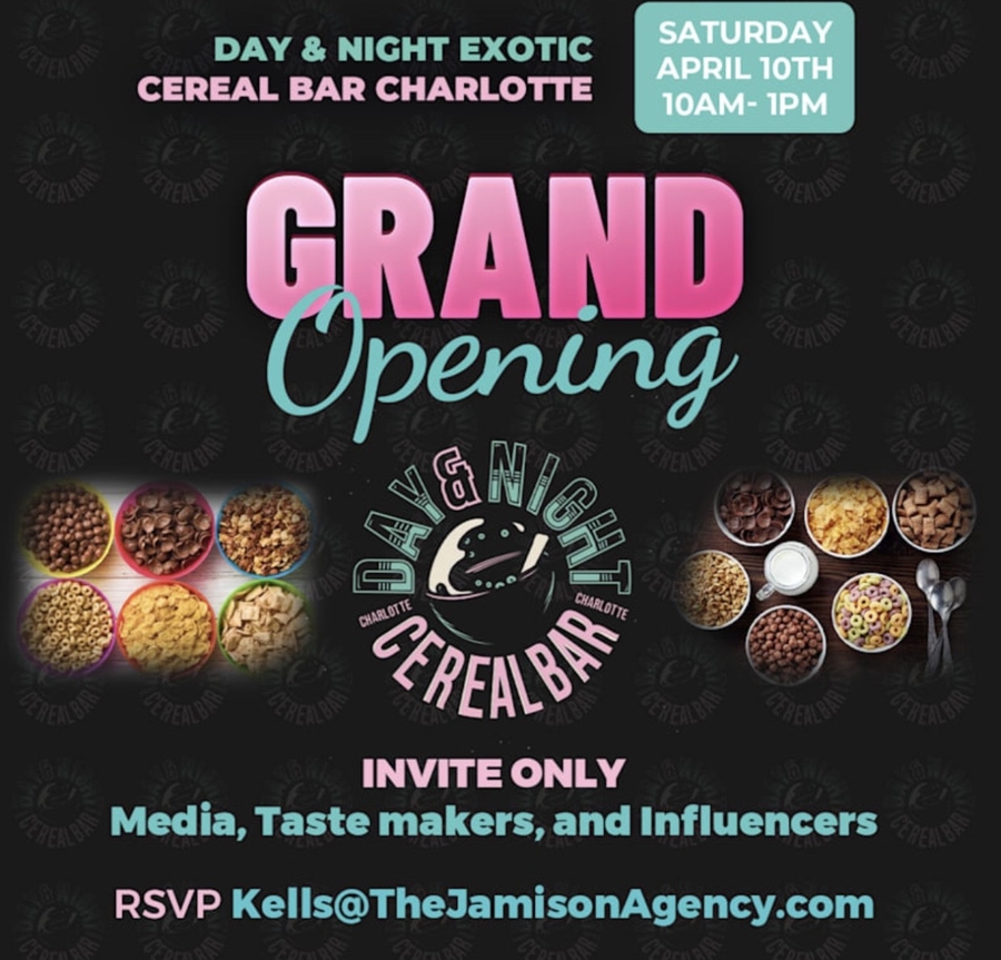 CHARLOTTE, NC, March 29, 2021 /24-7PressRelease/ -- Get ready to meet Day & Night Exotic Cereal Bar Charlotte. Greg Robinson and Danielle Booker are making history with the launch of Day & Night Exotic Cereal Bar Charlotte, the first and only cereal bar in Charlotte, NC. The bar will be officially launched at a grand opening to take place on Saturday, April 10, 2021, from 10am to 1pm. The private invite-only event will have the media, tastemakers, and influencers of Charlotte in attendance to witness a great day in history. It will also be open to the public from 1pm to 10pm, with customers treated to a unique breakfasting experience.