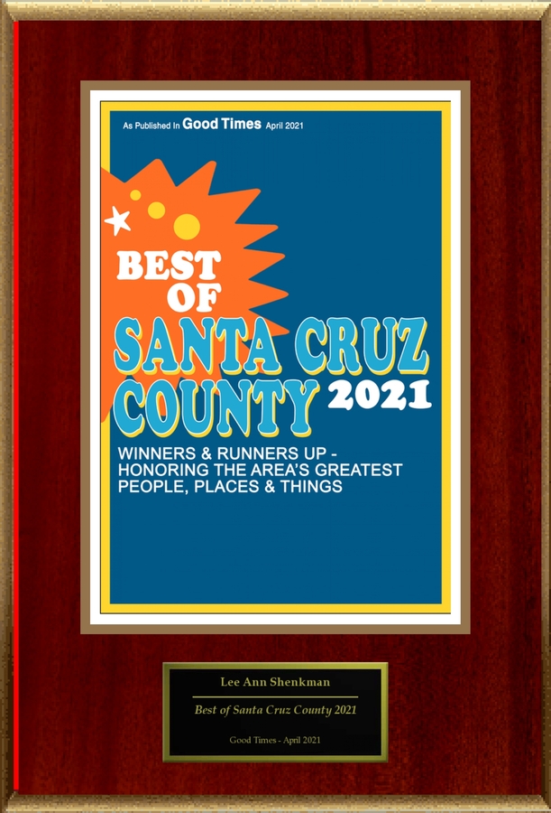 Following the publication of Lee Ann Shenkman's selection for Good Times's Best of Santa Cruz County 2021 list, American Registry seconded the honor and added Lee Ann Shenkman to the "Registry of Business Excellence™". An exclusive recognition plaque, shown here, has been designed to commemorate this honor.