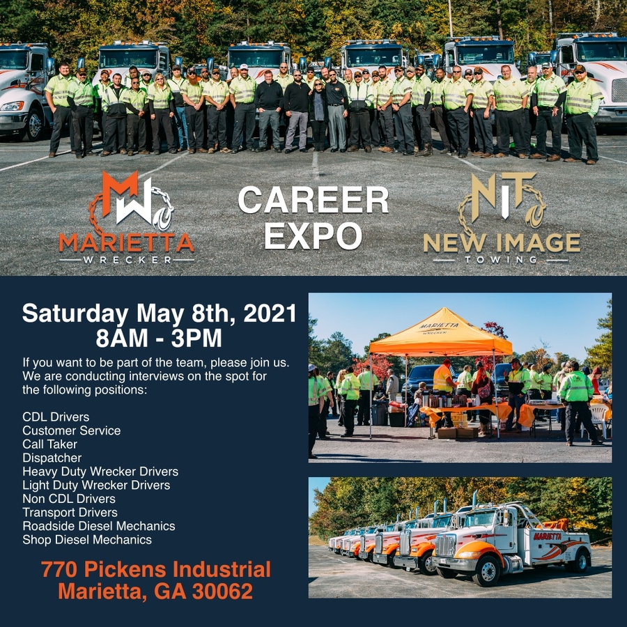 MARIETTA, GA, April 29, 2021 /24-7PressRelease/ -- After joining forces in February, Marietta Wrecker Service (MWS) and New Image Towing are pleased to announce they are continuing to grow their team of experienced towing and recovery specialists at a jointly hosted career expo on Saturday, May 8, from 8 a.m.–3 p.m. at 770 Pickens Industrial, Marietta, Georgia, 30062.