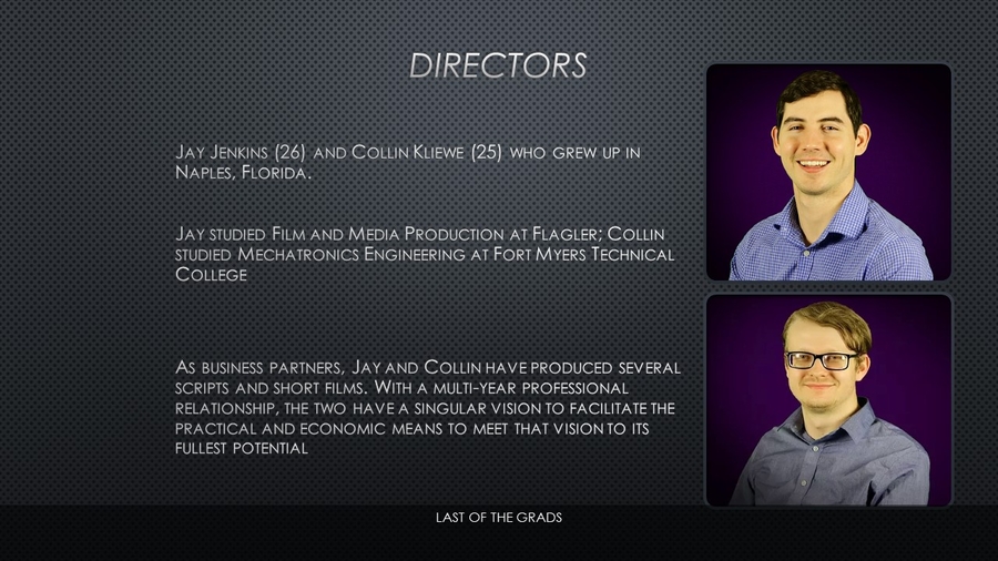 Jay Jenkins and Collin Kliewe are two young filmmakers who grew up in Naples, Florida as high school classmates at "Seacrest Country Day School". After college, they reconnected over their mutual love of movies and with the dream of creating their own feature length film. Over the summer, Jay and Collin secured local investors, assembled the cast and crew and shot at Seacrest for an intense 24-day shoot.