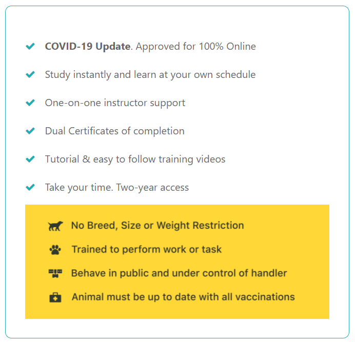 SDTSI Intensive Service Dog Training Course, once rendered online, has reached a higher level of convenience. The course can be accessed anywhere, anytime; lessons can be handily reviewed at one's will, and most importantly, every student can take the course at his/her own pace, adapting it to their daily schedule, thus becoming less stressful and more enjoyable. Providing the same competence with ease.