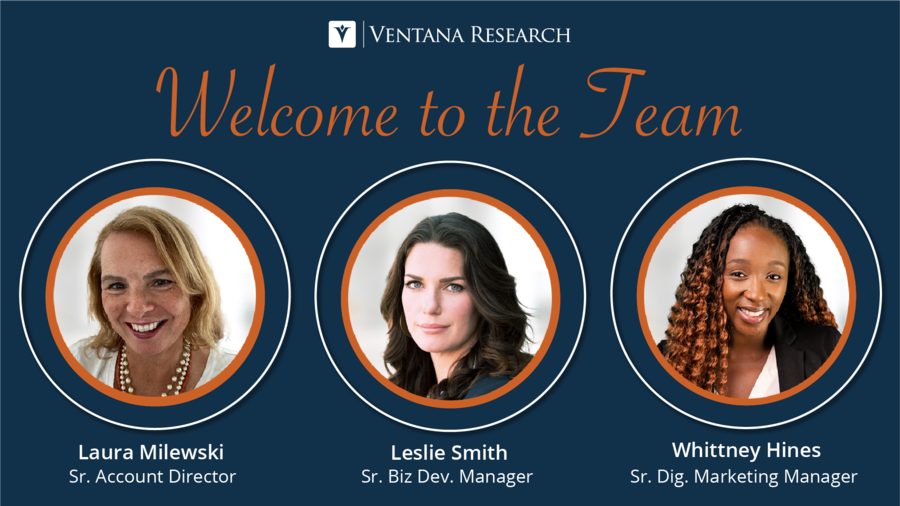 "I am really excited to continue our firm's growth with seasoned professionals who are committed to continuing our success through the Ventana eXperience," said Mark Smith, CEO and chief research officer at Ventana Research. "Having Laura, Leslie and Whittney join the team has been wonderful and their enthusiasm to the excellence in teamwork that we provide to our clients and the industry has been a welcome addition."