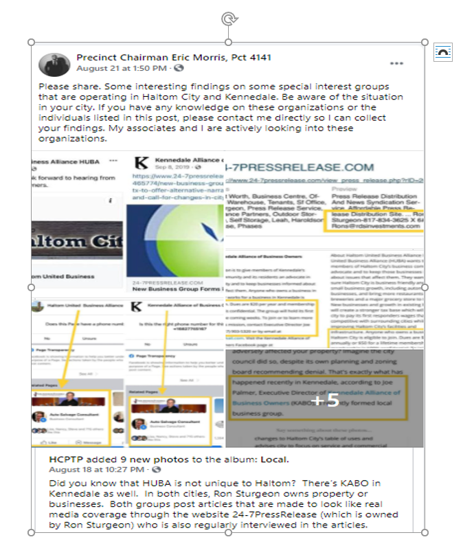 "On his official Republican Precinct Chairman Page on Facebook Eric Morris re-posted a post from Haltom City Politics, The Page, that said I am the owner of 24-7 press release, a nationwide company that distributes media releases for businesses, including Haltom United Business Alliance." "Simple web research on the company would have been enough to show that was not true," said Sturgeon.