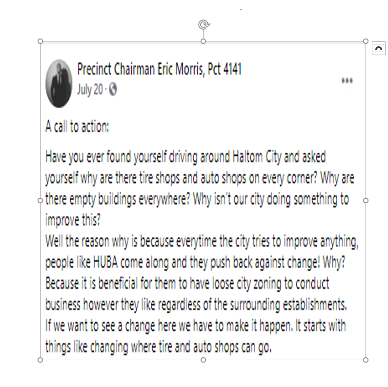 In drumming up support for the new restrictions, Morris posted about HUBA on his Republican Precinct Chairman Page: "Have you ever found yourself driving around Haltom City and wondered why there are tire and auto shops on every corner? Why are there empty buildings everywhere? Why isn't the city doing something to improve this? The reason is every time the city tries to improve anything people like HUBA come along and push back against change! Why because it is beneficial for them to have loose city zoning to conduct business however, they like, regardless of the surrounding establishments."