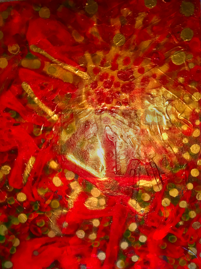 "This process is at a level that allows patterns & textures with words to appear from a universal alchemy I achieve through the meta-physical process I have developed with my universal cosmic X philosophy which induce trance like states that allow me to receive messages from other dimensions in cosmic revelations that are important for mankind to know as the ancient ones extend understanding which in essence is a cosmic reconnection for all beings."