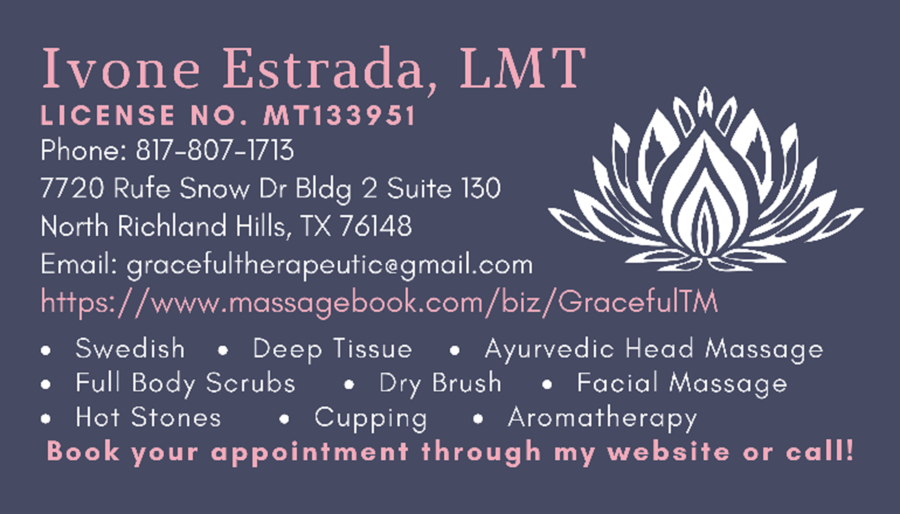 She went to massage therapy school at Tarrant County College and then got her therapy license from the State later. Estrada is also a certified medical massage therapist. At the Graceful Therapeutic Massage studio, she can deliver quality services to clients who experience all kinds of illnesses and injuries from everyday life. And the best part is, she is making medical massage therapy accessible to everyone.