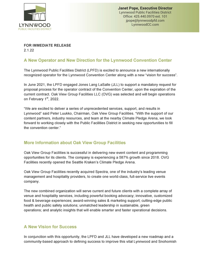 "We are excited to deliver a series of unprecedented services, support, and results in Lynnwood," said Peter Luukko, Chairman, Oak View Group Facilities. "With the support of our content partners, industry resources, and team at the nearby Climate Pledge Arena, we look forward to working closely with the Public Facilities District in seeking new opportunities to fill the convention center."