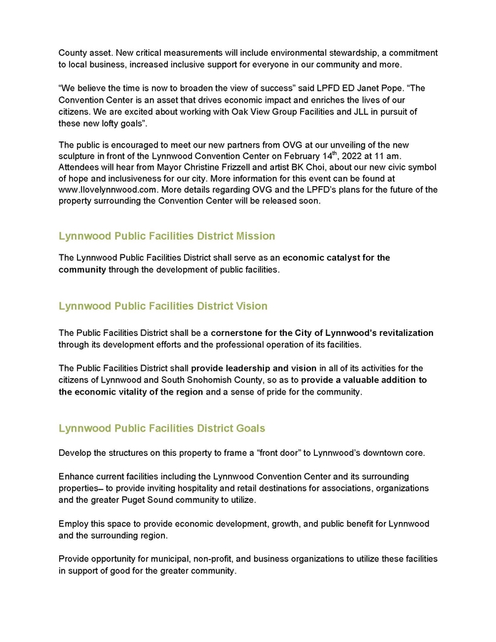 LYNNWOOD, WA, February 03, 2022 /24-7PressRelease/ -- The Lynnwood Public Facilities District (LPFD) is excited to announce a new internationally recognized operator for the Lynnwood Convention Center along with a new "vision for success".
