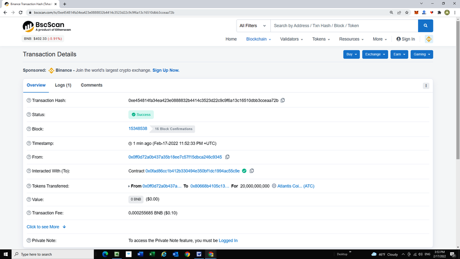 Data from BscScan shows that 20,000,000,000 ATC were transferred to Atlantis Exchange on Thursday, February 17, 2022. For details, see: https://bscscan.com/tx/0xe454814fa34ea423e0888832b4414c3523d22c9c9f6a13c16510dbb3cceaa72b