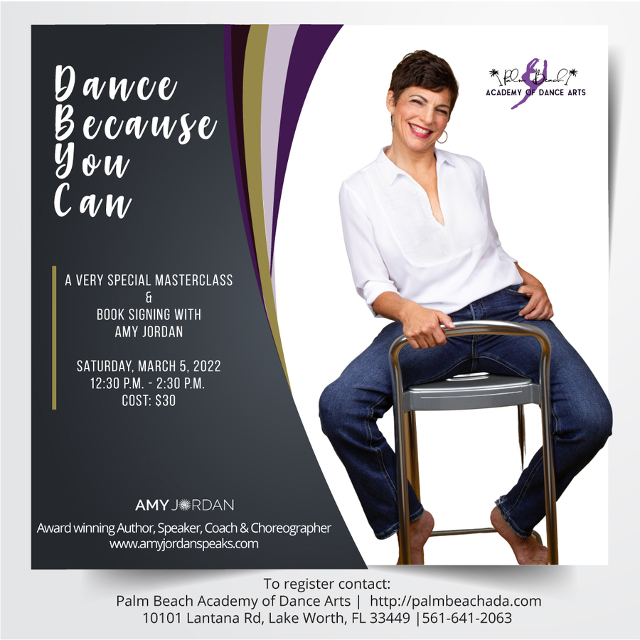The Masterclass and Book Signing event is Saturday, March 5, 2022, at the Palm Beach Academy of Dance Arts, 10101 Lantana Road, Lake Worth, Florida 33409.