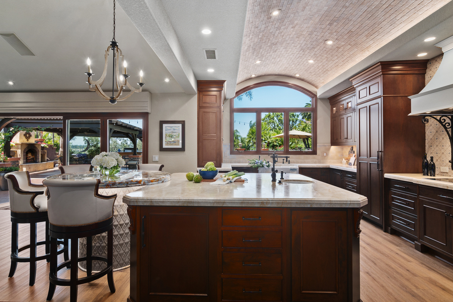 A retired couple who love to cook and entertain on a grand scale wanted a large, welcoming kitchen with traditional elements. The family room and kitchen in the existing design felt disconnected, and a substantial variation between ceiling heights in the two rooms made the kitchen feel dark and cave-like. The JDR team aimed to balance the scale of the two rooms and bring unity to the space with a Tuscan design with modern elements. An addition allowed for more space and the ceiling was raised. An arched window above the sink–along with new glass doors in the family room– strengthened the visual connection to a gorgeous backyard and pool. Substantial cherry cabinetry complements a meticulously crafted barrel ceiling. Wrought iron corbels on the cooktop hood and natural stone elements combine to give the new kitchen a feel of Old-World elegance. Softer design elements and layers of lighting bring a modern influence to the space, which now welcomes friends and family for large gatherings.