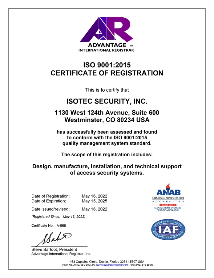 WESTMINSTER, CO, June 10, 2022 /24-7PressRelease/ -- Isotec Security solutions have been designated as Qualified Anti-Terrorism Technology by the Department of Homeland Security for nearly a decade, and they now have another highly esteemed certification to add to the list. With an ISO 9001:2015 Certification, Isotec has proven that its strict quality management systems will reliably produce products and services that meet customer demands and all relevant statutory and regulatory requirements.