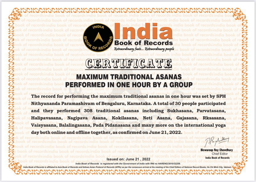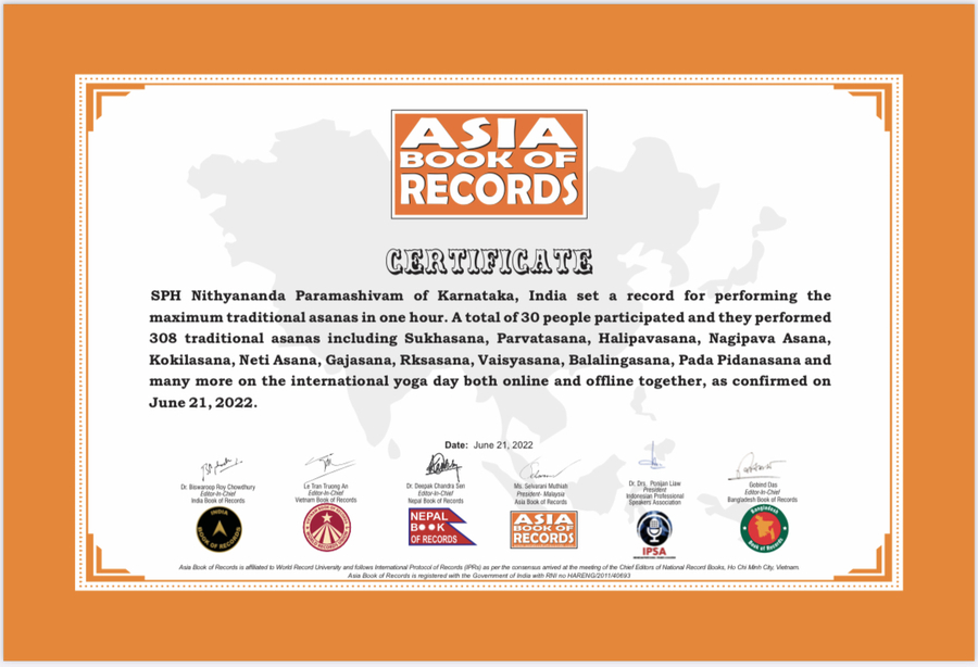 As a result, an Asia Book of Records Certificate and India Book of Records Certificate were awarded to The SPH Nithyananda Paramashivam for the maximum traditional asanas performed in one hour by a group – 308 traditional asanas including Parvatasana, Halipavasana, Nagipava Asana, Kokilasana, Neti Asana, Gajasana, Rksasana, Vaisyasana, Balalingasana, Pada Pidanasana and many more on the International Day of Yoga day both online and offline together, as confirmed on June 21, 2022.