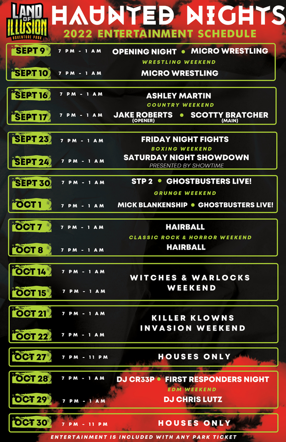 "We're excited for this year's incredible lineup providing 8-weekends of hair-raising fun, thrills and chills," stated Brett Oakley, owner of Land of Illusion. "From themed weekends, entertainment, and concerts by Ashley Martin, Mick Blankenship, and Hairball to a First Responders Night, there's frightful fun for everyone!"