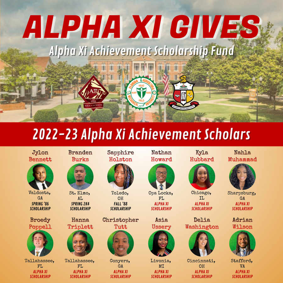 The Alpha Xi Gives scholarship initiative was founded in 2018 by alumni of the Alpha Xi Chapter of of Kappa Alpha Psi Fraternity, Inc. at Florida A&M University. The Alpha Xi Achievement Scholarship Fund and the Alpha Xi Endowment are managed by the Florida A&M University Foundation and Alpha Xi Gives.