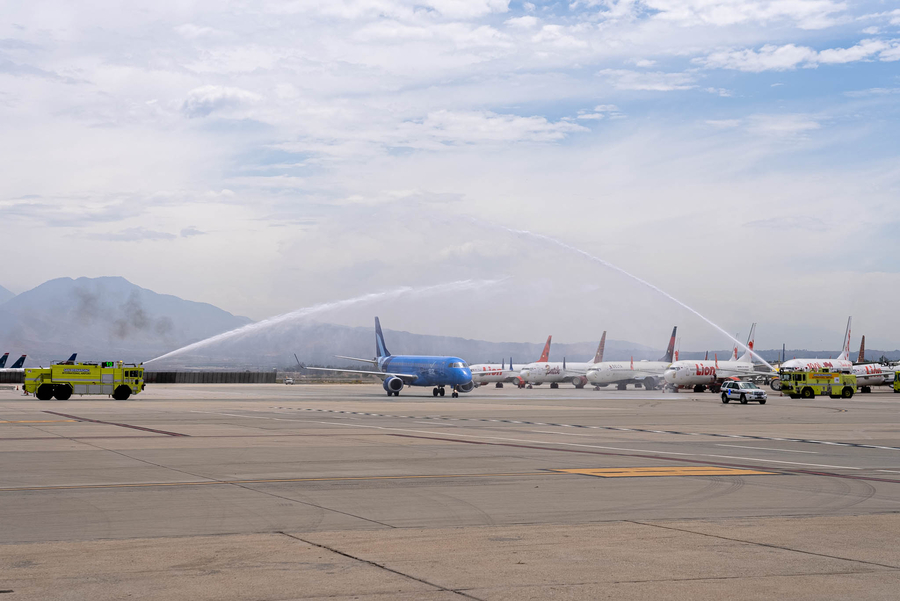 Passengers on the inaugural arriving Breeze Airways flight from SFO—which received a water arch welcome by San Bernardino County firefighters—included Provo Mayor Michelle Kaufusi, Breeze Airways President Tom Doxey, along with other Breeze team members. Arriving passengers were greeted in the terminal by airport staff, and each received a welcome gift bag filled with SBD-branded items.