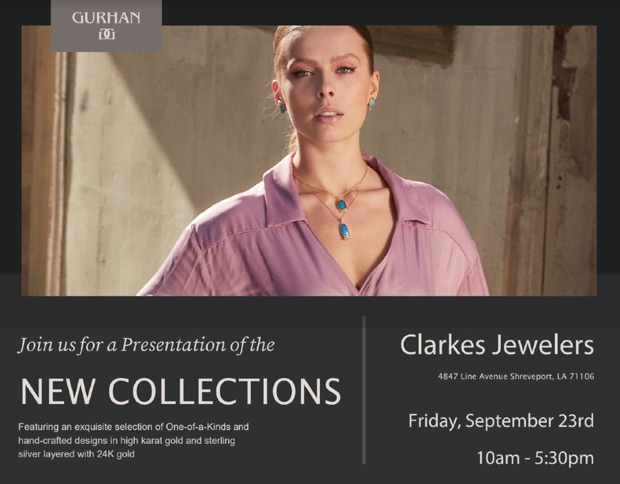 SHREVEPORT, LA, September 03, 2022 /24-7PressRelease/ -- Be one of the first to see the new jewelry collections by Gurhan when you join Clarkes Jewelers on September 23rd for the brand's presentation of their newest pieces. The event will take place in Clarkes Jewelers Shreveport showroom from 10 am to 5:30 pm with no RSVP necessary.