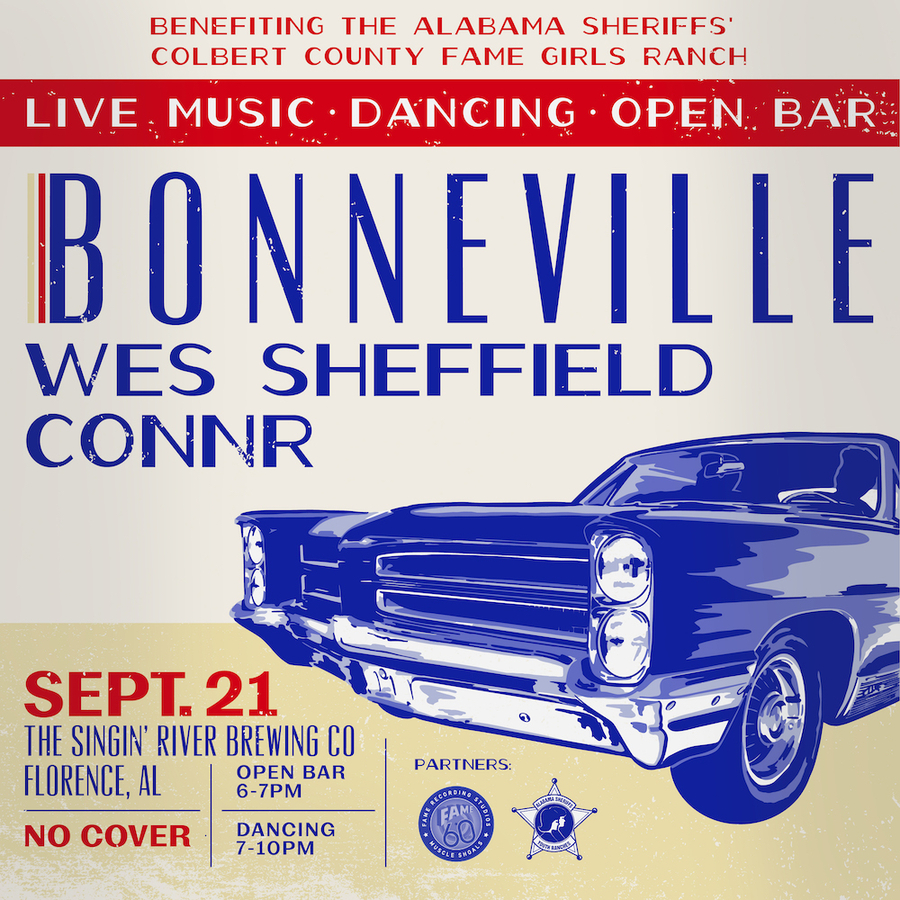 Following on the heels of their latest premiere of 'Hard To Love,' by Relix Magazine, released August 24th, 2022, the Southern retro soul band, Bonneville, kickoff their tour with the first live showcase performance at Singin' River Brewing Company, Florence, AL, September 21st, 2022, co-hosted by the acclaimed FAME Recording Studios. Opening acts for this showcase include CONNR and Wes Sheffield. Proceeds from this performance – silent auction items donated by FAME Recording Studios including an original hand-painted impressionistic artwork by visual artist, Walter Simon, along with 150 limited edition, numbered, collectable screen printed autographed posters – will be donated to the Alabama Sheriffs' Colbert County FAME Girls' Ranch, a nonprofit 501C charity and FAME Recording Studios Foundation, with a mission to provide long-term, safe, residential care for at-risk girls to obtain sustainable healing and self-care skills to overcome their life's trauma. Rodney Hall, Co-Owner, FAME Publishing/FAME Studios expresses, "We love working with Bonneville and are grateful for their support on this benefit showcase. Their funky grooves ooze the Muscle Shoals Sound!" Misty Smith, Director of ASYR FAME Girls Ranch further adds, "Alabama Sheriffs' Colbert County FAME Girls Ranch is a place for young girls to heal and we believe that Music is one of God's gifts to help people heal. We are very humbled and blessed that Bonneville has chosen to benefit our ministry."