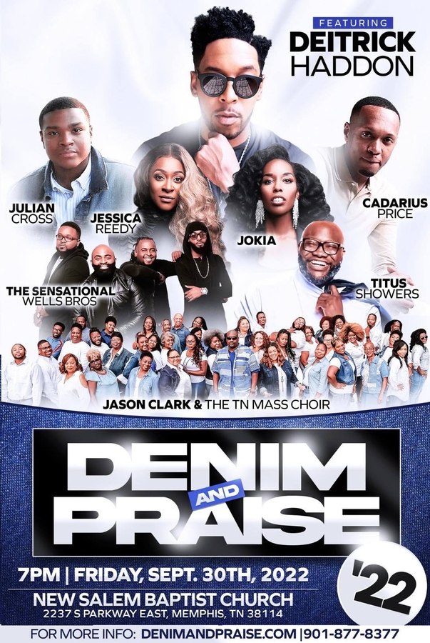 Put on your best blue jean outfit and join us for a night of great music, high praise, and heartfelt worship at Denim and Praise: The Blue Jean Praise Party, to be held at 7:00 PM, Friday, September 30th at New Salem Baptist Church, 2237 South Parkway East in Memphis, TN.