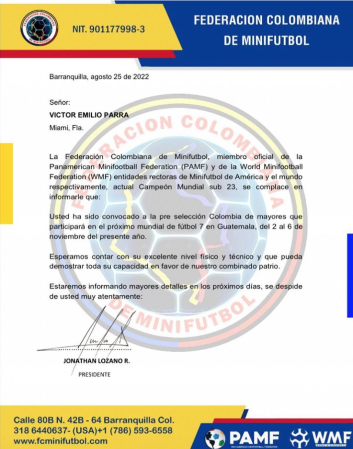 ''Very excited to announce I have officially been called up to represent the Colombia Mens National team in this years World Cup in November being held in Guatemala. World mini football 7 v 7 pan American games. Humbled to have been chosen to play on such a talented squad.''