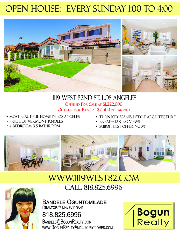 For more information or to schedule an in-person tour with Bandele Oguntomilade, call 818-825-6996 or visit https://www.BogunRealtyAndLuxuryHomes.com or https://bogunrealtyandluxuryhomes.com/Testimonials