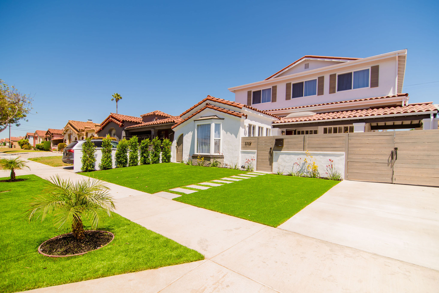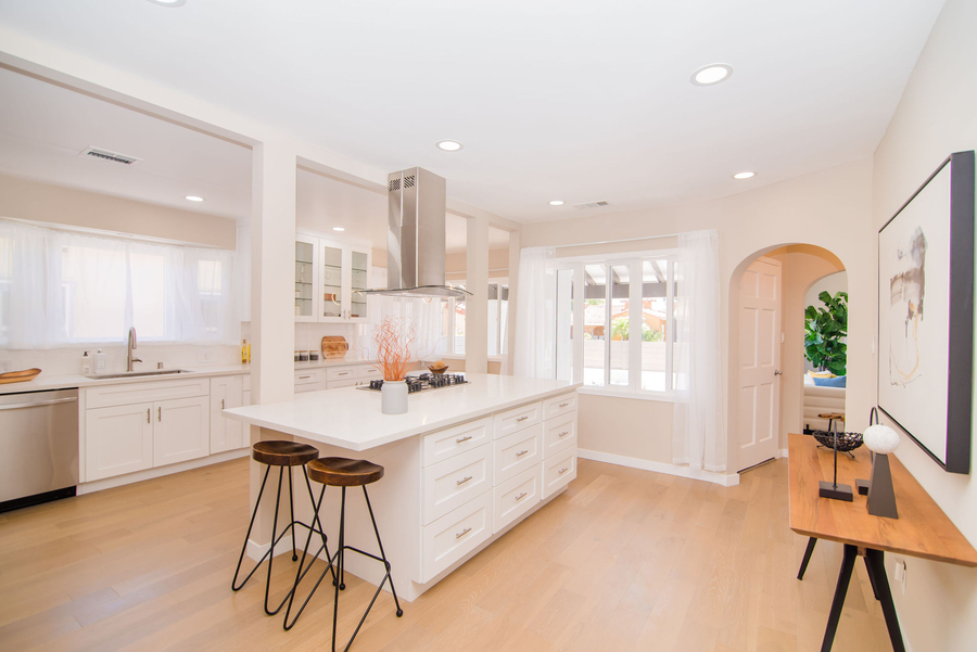 Interior design is a contemporary California open-floor plan at its best, maximizing indoor-outdoor living through limitless double-pane picture windows, French doors and glass sliders and integrating front patio seating areas and backyard kitchen and entertainment areas. A proper welcoming foyer with arched entryways ushers in sprawling living room with fireplace and stunning views. Other wonderful features include central air and heating, 2 nest thermostats, engineered wood flooring, endless recessed ceiling lights, ultra-modern chandeliers, shaker cabinets, quartz countertops, subway tiles, higher capacity electrical panel, 50 gallon water heater, separate laundry room, 2-car detached garage ready for conversion to an accessory dwelling unit (ADU), extra-long driveway to accommodate many cars, and a fully fenced, gated and private compound with security cameras. Also beautifully landscaped for water conservation and energy savings with artificial grass, real Ficus trees, Podocarpus Gracillior, and colorful Kangaroo Paws.