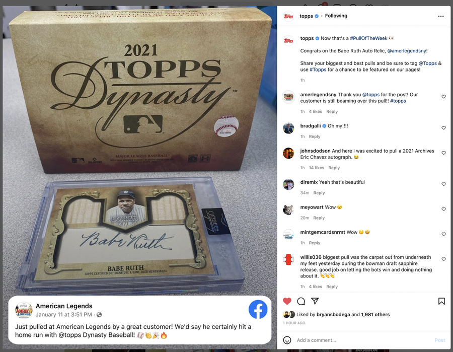 So is seeing a great customer pull a monster card. In early 2021, a 1/1 Babe Ruth signed card with two bat pieces from Topps Dynasty Baseball came out of a one-pack box. This rare card is worth upwards of $60,000. The lucky collector was VERY excited and happy!!