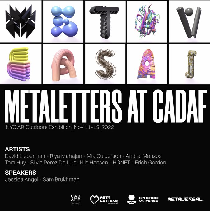 At the CADAF MetaLetters presenting artists who created the 10 AR-letters that spell the word METAVERSAL. To view these giga letters on display on top of the @web3nycgallery building at 510 5th Avenue and later to find them in a tour from Bryant Park through Times Square, the Hudson Yards, down to Chelsea via the Highline Park, spectators have to download and use the application created by Spheroid Universe