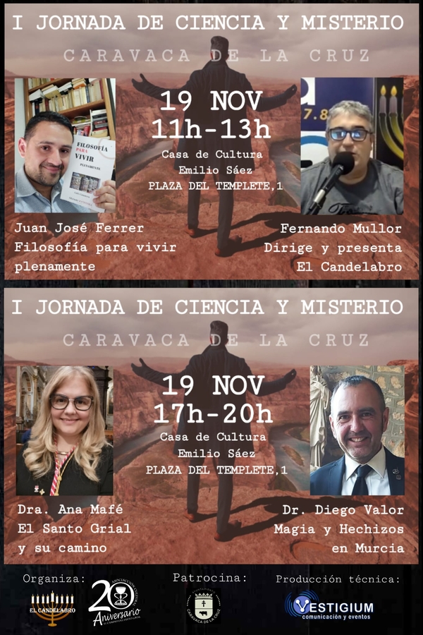 On Saturday morning at the Emilio Sáez Cultural Centre in Caravaca de la Cruz, the director and presenter of the programme El Candelabro: https://elcandelabro.es/, Fernando Mullor, who is organising this event together with the Cultural Association El Camino del Santo Grial, which is celebrating its 20th anniversary, with the sponsorship of the City Council of Caravaca de la Cruz and the technical production of Vestigium, will be present.