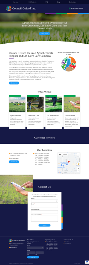 Council-Oxford Inc. is a Ruskin, Florida-based agrochemical supplier and DIY lawn care company. The company offers a wide range of products for farmers, nursery's, horticulturists, and homeowners, including herbicides, insecticides, fungicides, and fertilizers. Council-Oxford Inc provides agrochemicals and lawn are services in the broader Tampa Bay area: Bradenton, Parrish, Wimauma, Tampa, Riverview, Brandon, St Pete, Ruskin, Apollo Beach, Myakka, Sarasota, Sun City Center, Lithia, Wauchula, Duette, etc. Council-Oxford Inc is privately held and headquartered in Ruskin, FL.