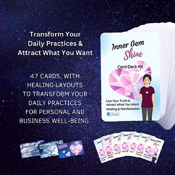 Inner Gem Shine was inspired by Sandra's work with clients who constantly struggled to practice small changes in their lives on a daily basis. The card deck and resource kit are designed to help people maintain focus on their intentions, developing daily practices that contribute to transformation in their lives, relationships, and businesses. The kit includes a carrying tin, heart-shaped notes, a crystal, and instructional videos.