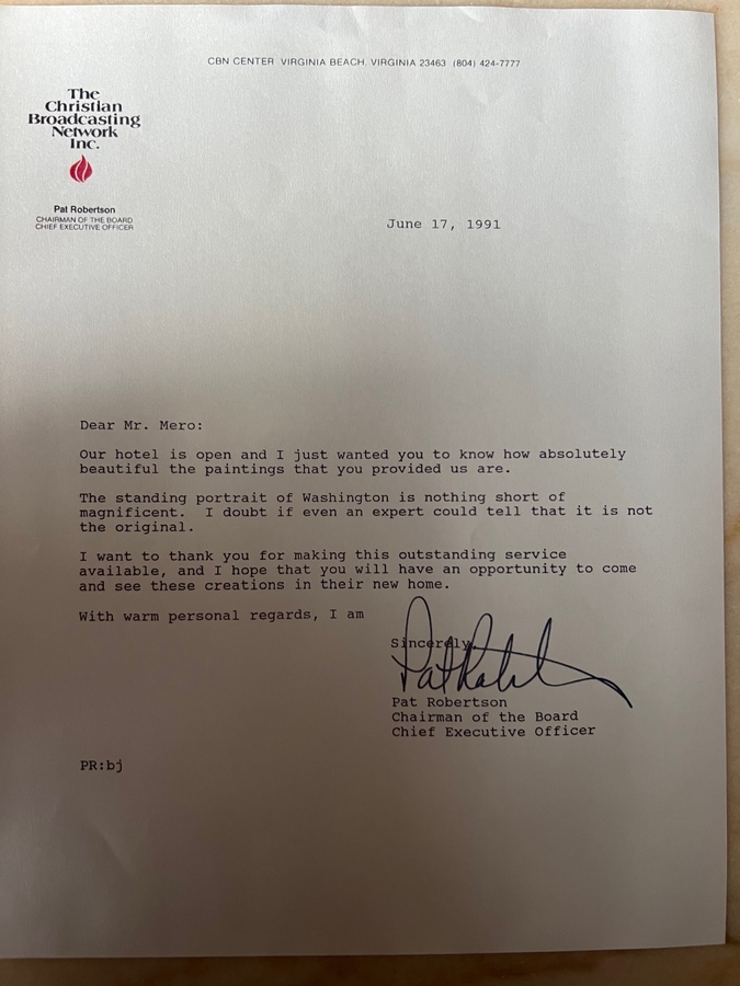 Robertson also commented on these other works, "Our hotel is open and I just wanted you to know how absolutely beautiful the paintings that you provided us are. The standing portrait of Washington is nothing short of magnificent. I doubt if even an expert could tell that it is not the original. I want to thank you for making this outstanding service available, and I hope that you will have an opportunity to come and see these creations in their new home."