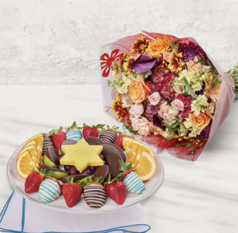 If you are hosting for the holidays or need to add some fun to the party, consider the Holly Jolly Dipped Platter, featuring a white chocolate-dipped pineapple snowman surrounded by chocolate-dipped pineapple stars and other fruity favorite. The Hanukkah Dessert Tray and Fresh Flower Gift, is a beautiful combo that comes complete with a Star of David-shaped pineapple, and the flowers will remain fresh for all eight nights!