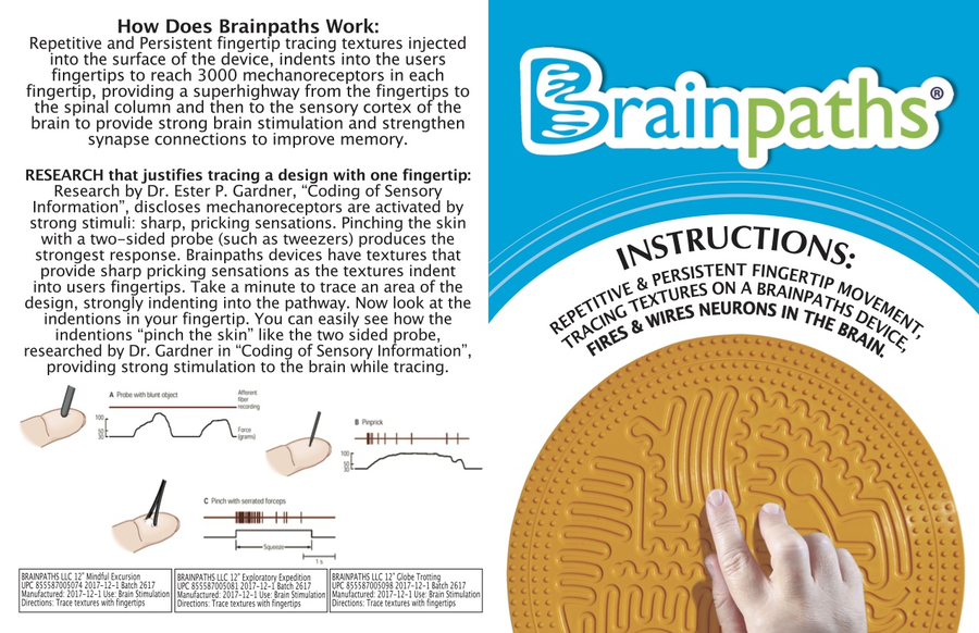 The Brainpaths device improves cognitive functioning by firing and wiring neurons in the brain by utilizing their sense of touch. The Brainpaths device activates over 3,000 mechanoreceptors simultaneously under the ten fingers. People repeatedly trace the pattern on the circular pad of the device with their fingers. Tracing the patterns activates the mechanoreceptors that send signals to the brain to fire (activate) and wire (develop networks) neurons. The repetitive tracing on the same pattern fires and wires the same set of neurons every time, significantly increasing the brain's ability to memorize neural network responses. Memorizing the neural sequence and networks is beneficial for enhancing memory and cognitive functioning while preventing dementia, Alzheimer's disease, and other neurodegenerative and memory disorders. The Brainpaths device helps prevent memory and cognitive disorders among the elderly by keeping their minds healthy and active.